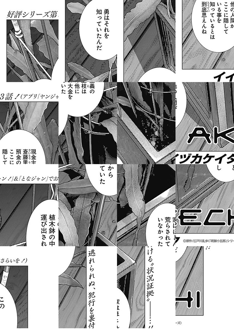 「GANTZ:G」のイイヅカケイタ、週刊初連載!“現代版・アケチコゴロウ事件簿”が巻頭カラーで新連載開始!! 舞台は現代、有象無象の事件が混在する街・東京。古書店を営む明智小五郎(25)と、その幼馴染で刑事の波越英一郎が本の街・神保町で謎に挑む…!国民が知る“かの名探偵”、新解釈でいま蘇る!!