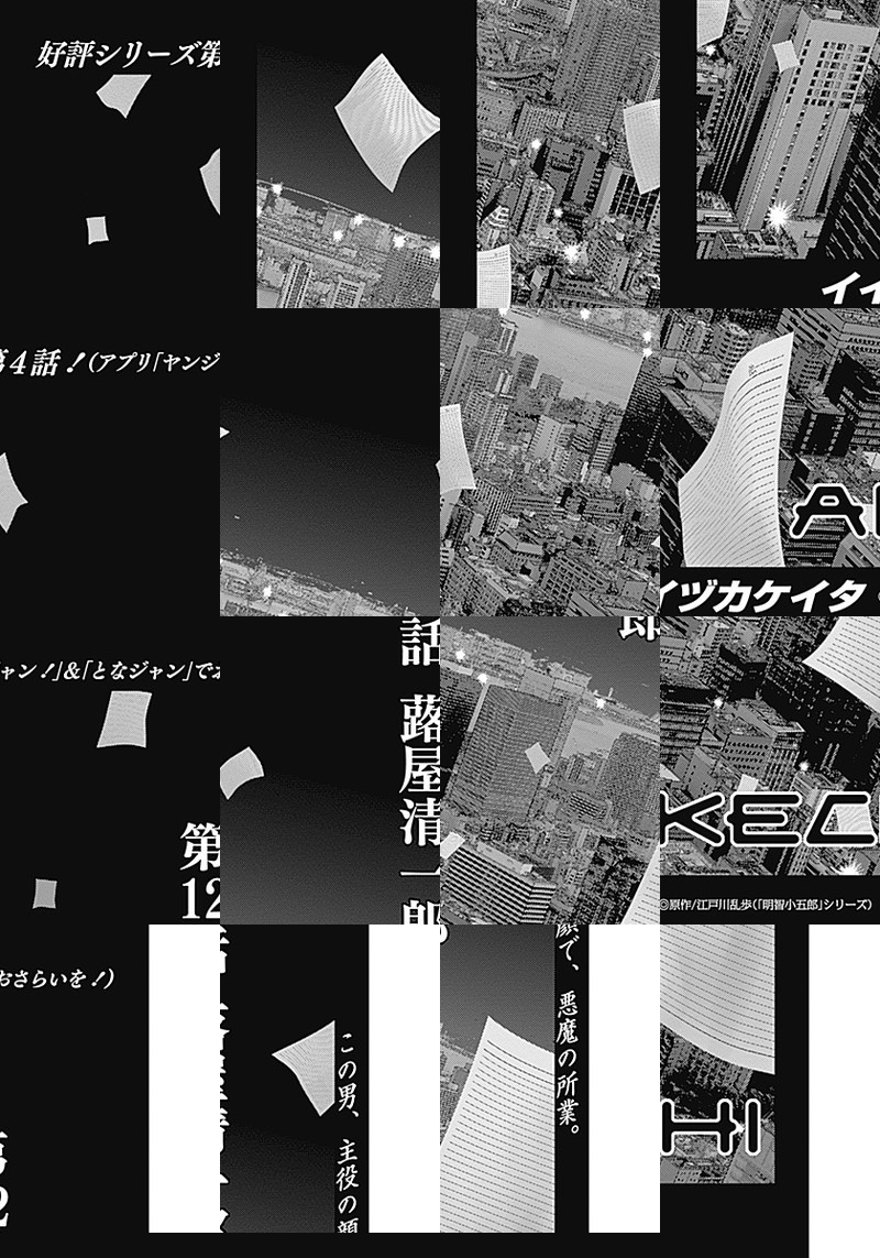 「GANTZ:G」のイイヅカケイタ、週刊初連載!“現代版・アケチコゴロウ事件簿”が巻頭カラーで新連載開始!! 舞台は現代、有象無象の事件が混在する街・東京。古書店を営む明智小五郎(25)と、その幼馴染で刑事の波越英一郎が本の街・神保町で謎に挑む…!国民が知る“かの名探偵”、新解釈でいま蘇る!!