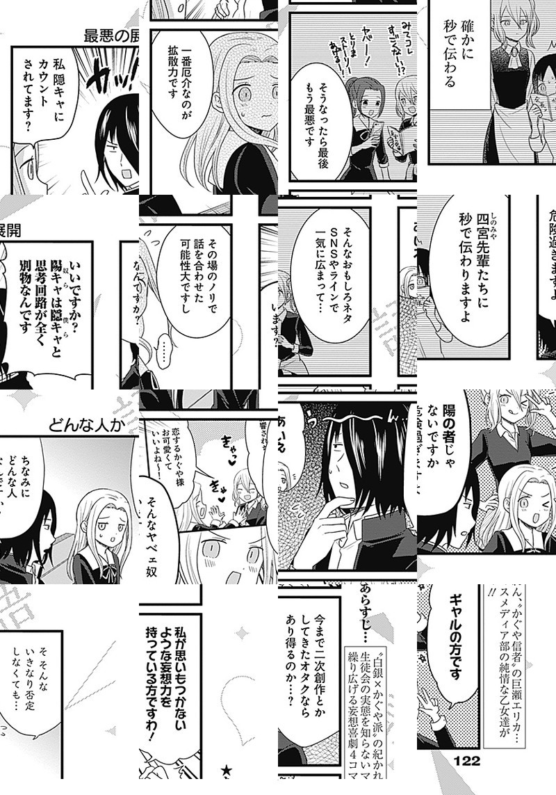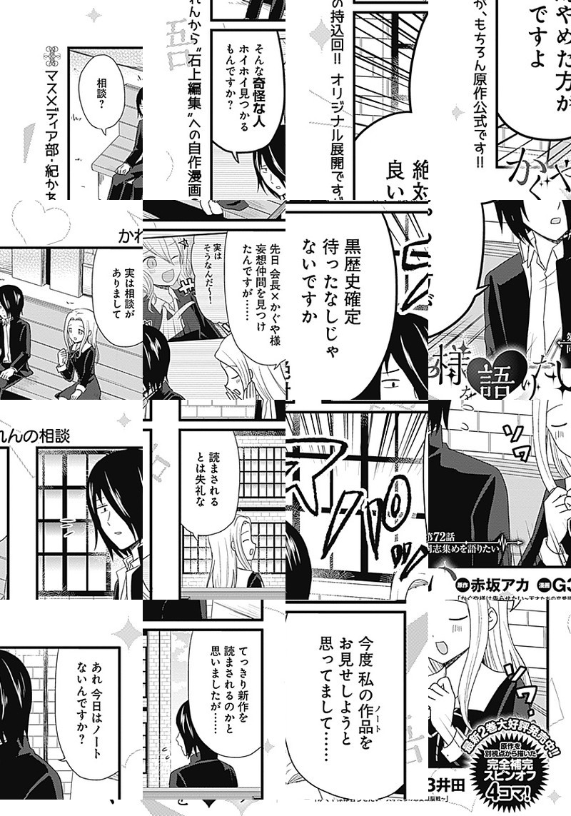 『かぐや様は告らせたい〜天才たちの恋愛頭脳戦〜』TVアニメ化記念、週刊ヤングジャンプ本誌でもスピンオフ作品が連載開始しました。 生徒会の実態を知らない、マスメディア部のメンバーが繰り広げる妄想喜劇4コマ!!