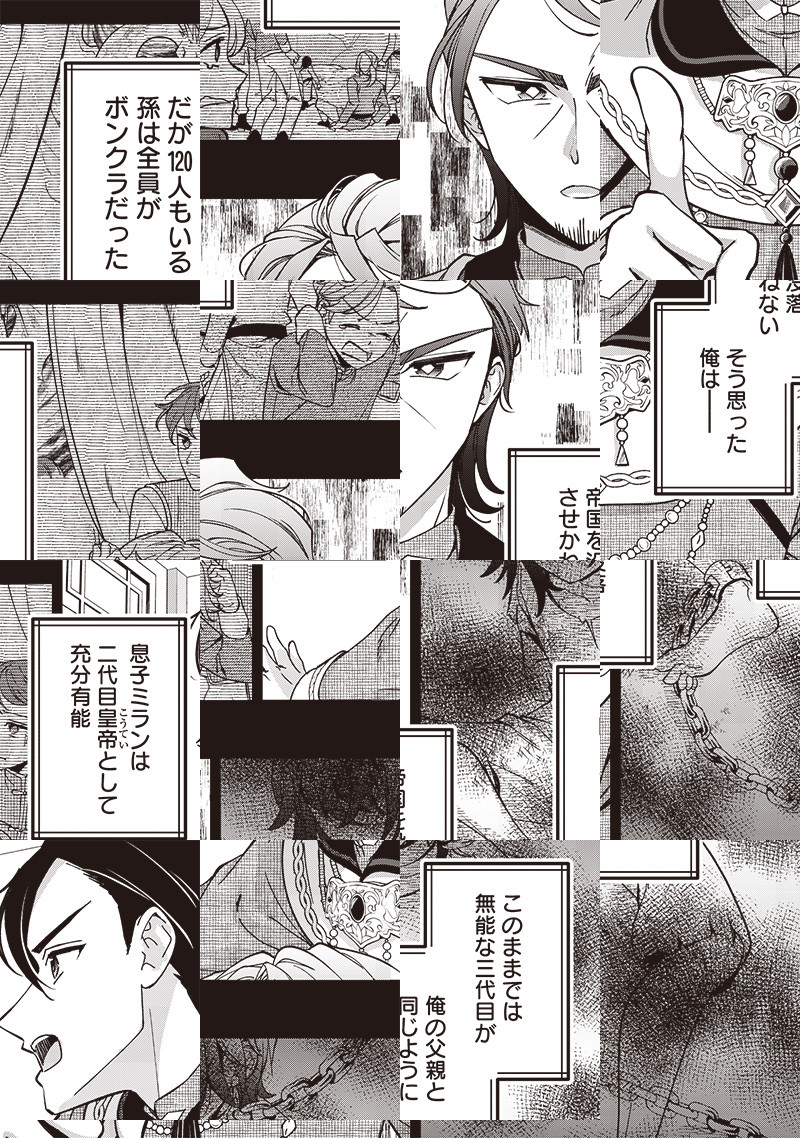奴隷から成り上がり、一代で帝国を築き上げたティムール。 しかし、120人いる孫は全員無能なようで……このままでは帝国が滅びてしまう! ティムールは皇帝である自分の孫に転生することを思いつき…!? 成り上がりの皇帝が自分の孫に生まれ変わる! 皇族転生無双ストーリー開幕!!