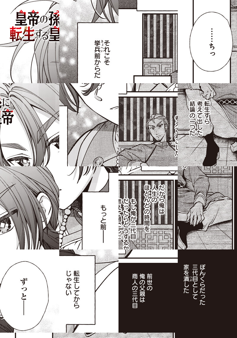 奴隷から成り上がり、一代で帝国を築き上げたティムール。 しかし、120人いる孫は全員無能なようで……このままでは帝国が滅びてしまう! ティムールは皇帝である自分の孫に転生することを思いつき…!? 成り上がりの皇帝が自分の孫に生まれ変わる! 皇族転生無双ストーリー開幕!!