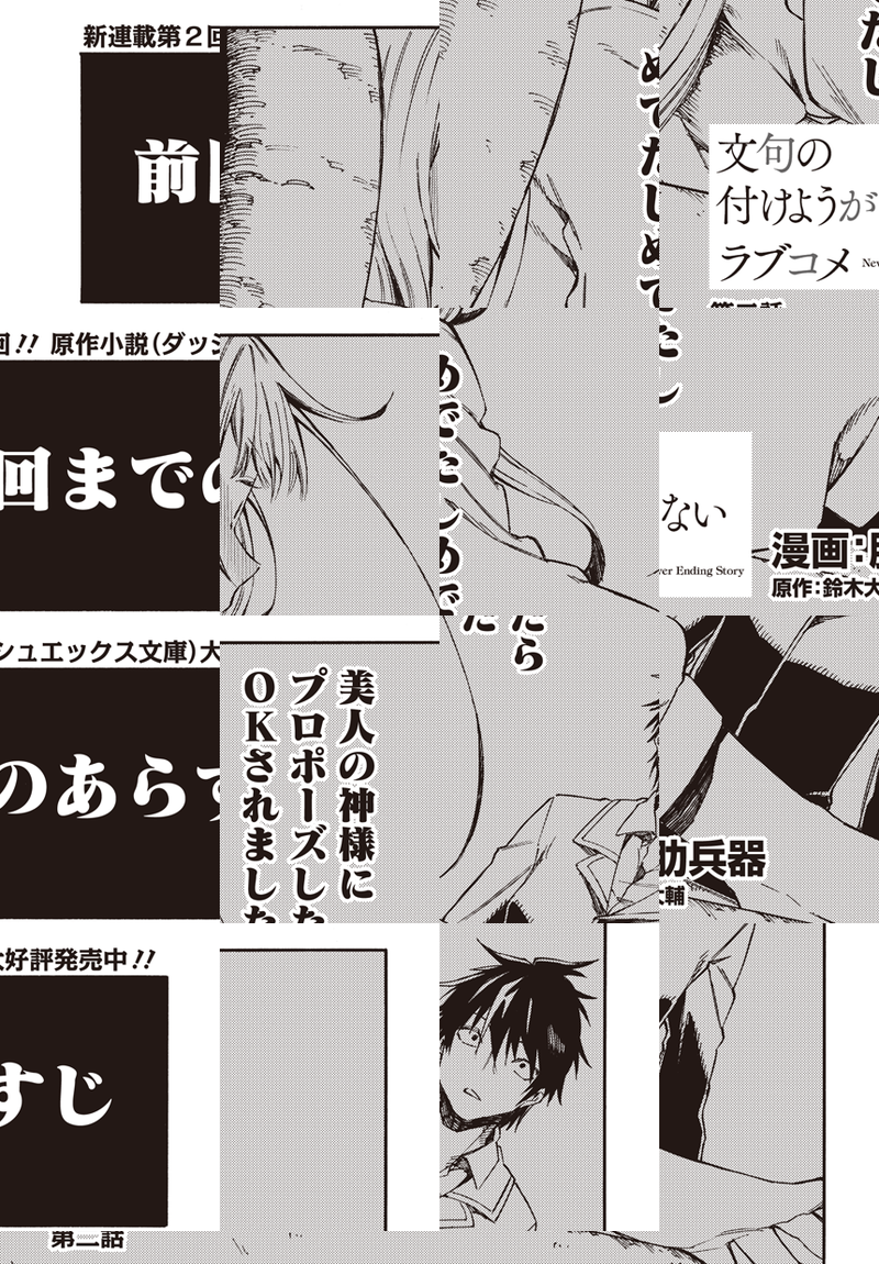 “千年を生きる神”神鳴沢セカイは、銀髪赤眼の美少女。世間知らずで尊大で、見た目は幼いのに酒と葉巻をたしなみ、一日中お屋敷で本を読んで過ごしている。 彼女の”生贄”として捧げられた高校生・桐島ユウキ。『生贄になる代わりに何でも言うことを聞いてやろう』と言われた彼はこう願い出た――「神鳴沢セカイさん。俺と結婚してください」。 そして始まるふたりの生活だが――穏やかで他愛のない日々は、やがて世界が抱える恐るべき秘密によって狂い始めていく。 どこまでも純粋な二人の愛の喜劇《ラブコメディ》。決して果てることのない物語がここに始まる! ライトノベル『文句の付けようがないラブコメ』の超速コミカライズ開幕!!