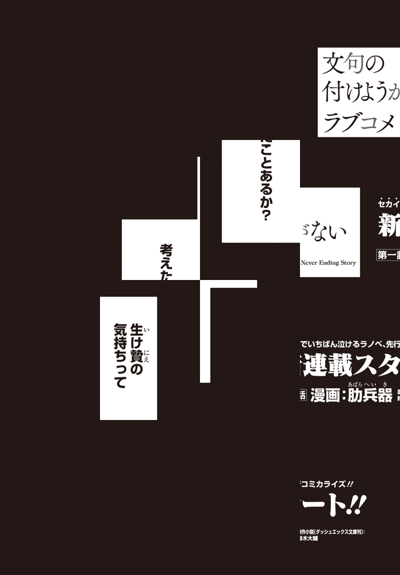 “千年を生きる神”神鳴沢セカイは、銀髪赤眼の美少女。世間知らずで尊大で、見た目は幼いのに酒と葉巻をたしなみ、一日中お屋敷で本を読んで過ごしている。 彼女の”生贄”として捧げられた高校生・桐島ユウキ。『生贄になる代わりに何でも言うことを聞いてやろう』と言われた彼はこう願い出た――「神鳴沢セカイさん。俺と結婚してください」。 そして始まるふたりの生活だが――穏やかで他愛のない日々は、やがて世界が抱える恐るべき秘密によって狂い始めていく。 どこまでも純粋な二人の愛の喜劇《ラブコメディ》。決して果てることのない物語がここに始まる! ライトノベル『文句の付けようがないラブコメ』の超速コミカライズ開幕!!