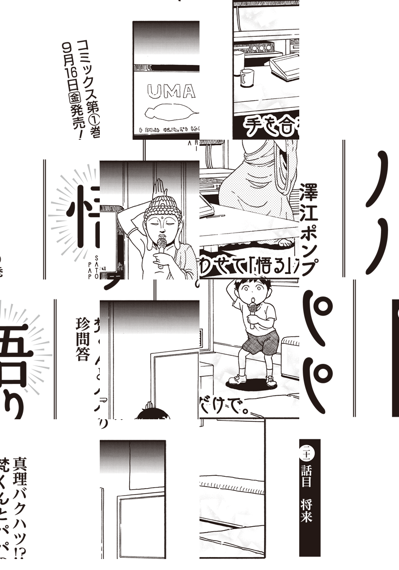 脱サラして「悟り」を開いたパパ。 仏の教えを説きながら主夫業に勤しむパパのことを (ちょっと変だなと思いつつ)慕う小学生の息子、梵くん。 そして、二人を(ほどよく)見守る会社勤めのママ。 この物語はそんな一家を描いた珍妙なフィクションです。 ★描き下ろし特別編&おまけ漫画も収録! 「悟りパパ」コミックス第1巻発売中!