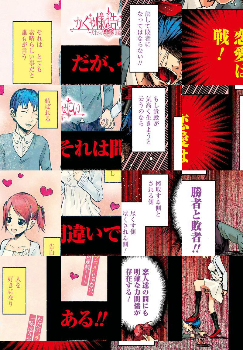 「恋愛は告白した方が負けなのである!」 家柄も人柄も良し!! 将来を期待された秀才が集う秀知院学園!! その生徒会で出会った、副会長・四宮かぐやと会長・白銀御行は互いに惹かれているはずだが…何もないまま半年が経過!! プライドが高く素直になれない2人は、面倒臭いことに、“如何に相手に告白させるか”ばかりを考えるようになってしまった!? 恋愛は成就するまでが楽しい!! 新感覚“頭脳戦”ラブコメ、開戦!!