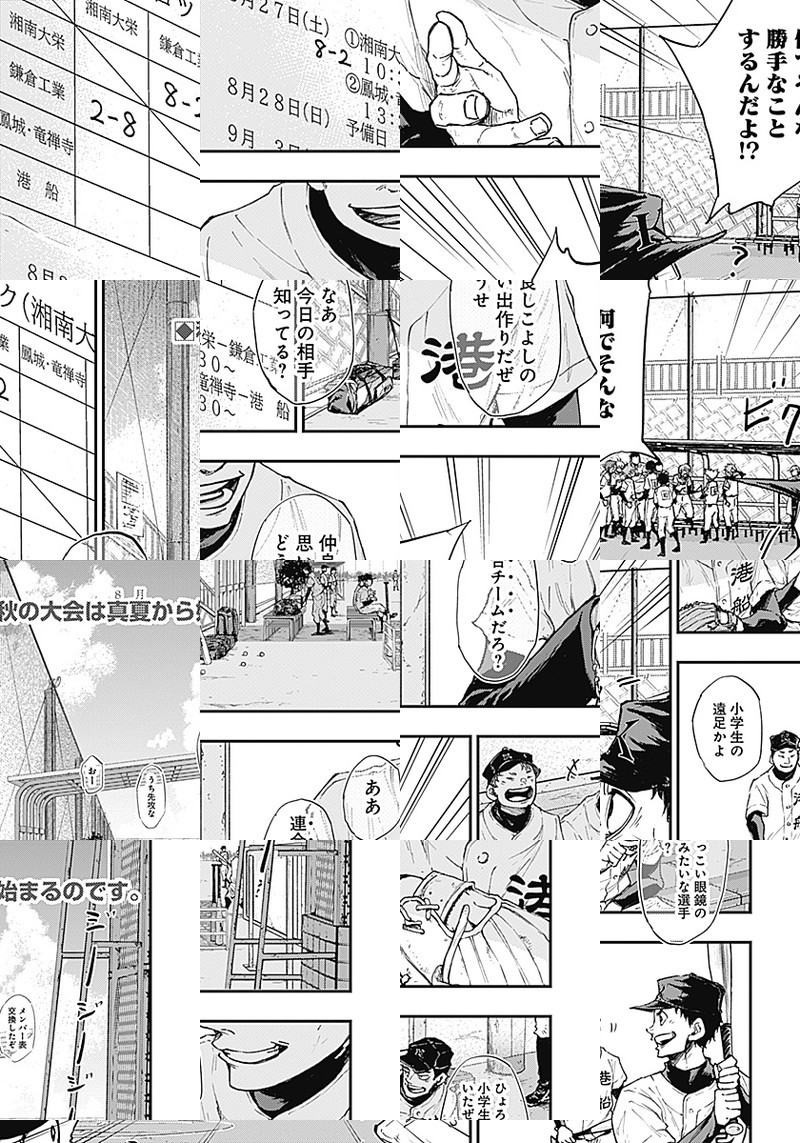 汗を流す姿を「無駄」と切り捨てる高校生・守崎夜畔(モリサキヨハン)。 ある日駅でキーホルダーを拾ったのをキッカケに薙居尾朗(カルイビロー)に「魔物退治」に誘われ…。 野球界に新たな価値観を提示する高校野球譚、ここに始動!