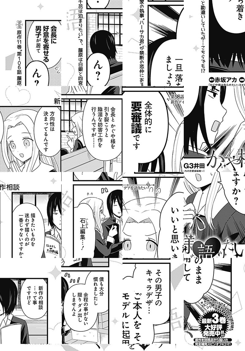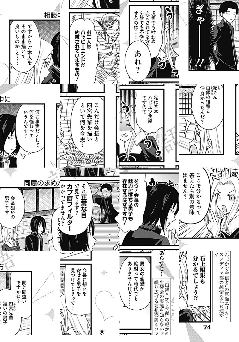 『かぐや様は告らせたい〜天才たちの恋愛頭脳戦〜』TVアニメ化記念、週刊ヤングジャンプ本誌でもスピンオフ作品が連載開始しました。 生徒会の実態を知らない、マスメディア部のメンバーが繰り広げる妄想喜劇4コマ!!