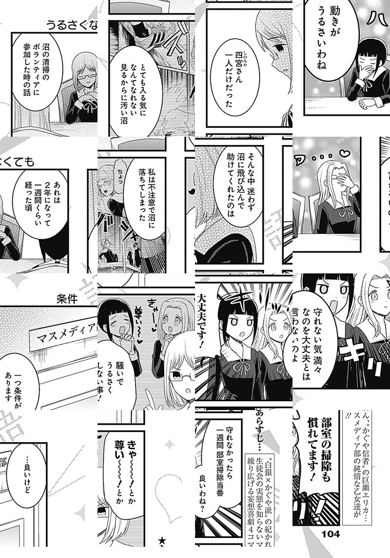 『かぐや様は告らせたい〜天才たちの恋愛頭脳戦〜』TVアニメ化記念、週刊ヤングジャンプ本誌でもスピンオフ作品が連載開始しました。 生徒会の実態を知らない、マスメディア部のメンバーが繰り広げる妄想喜劇4コマ!!