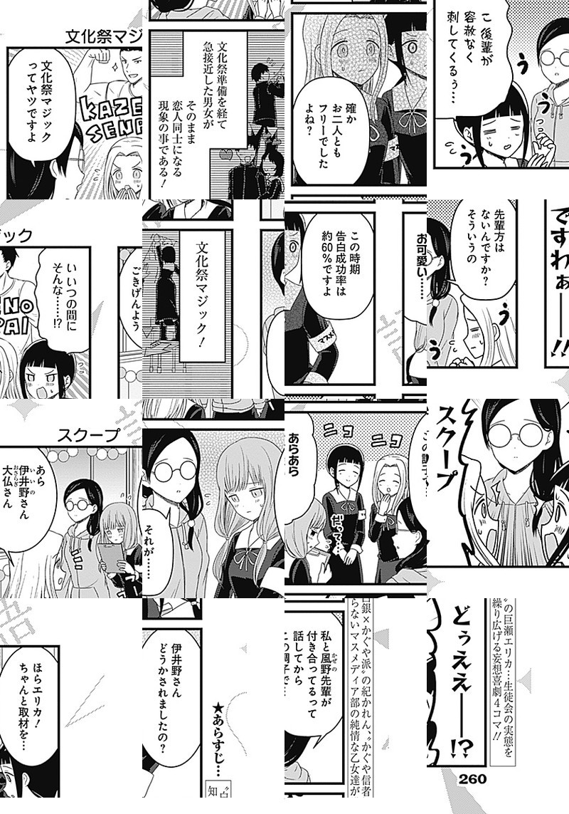 『かぐや様は告らせたい〜天才たちの恋愛頭脳戦〜』TVアニメ化記念、週刊ヤングジャンプ本誌でもスピンオフ作品が連載開始しました。 生徒会の実態を知らない、マスメディア部のメンバーが繰り広げる妄想喜劇4コマ!!