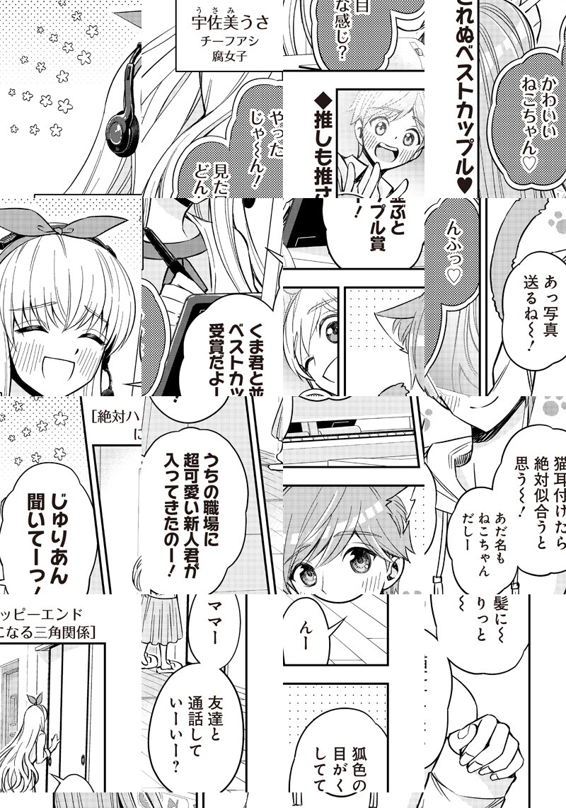 漫画家志望で入賞以上・プロ未満のねこちゃん(♂)の夢は、「世界に届くヒット作をつくること!!」 その修行の為、憧れの超ヒットメーカー宇佐美先生の元へアシスタントに入ることになったねこちゃんを…待っていたのは!!? チーフスタッフのうさ先輩(♀)と先輩アシのくまくん(♂)職場から始まる三角関係(なのに)ハッピーLOVEライフ!! 男女✕男男=幸せ確約! 好きな貴方と好きなだけ♡ 博愛不埒なコミック・コメディ新連載です♪♪