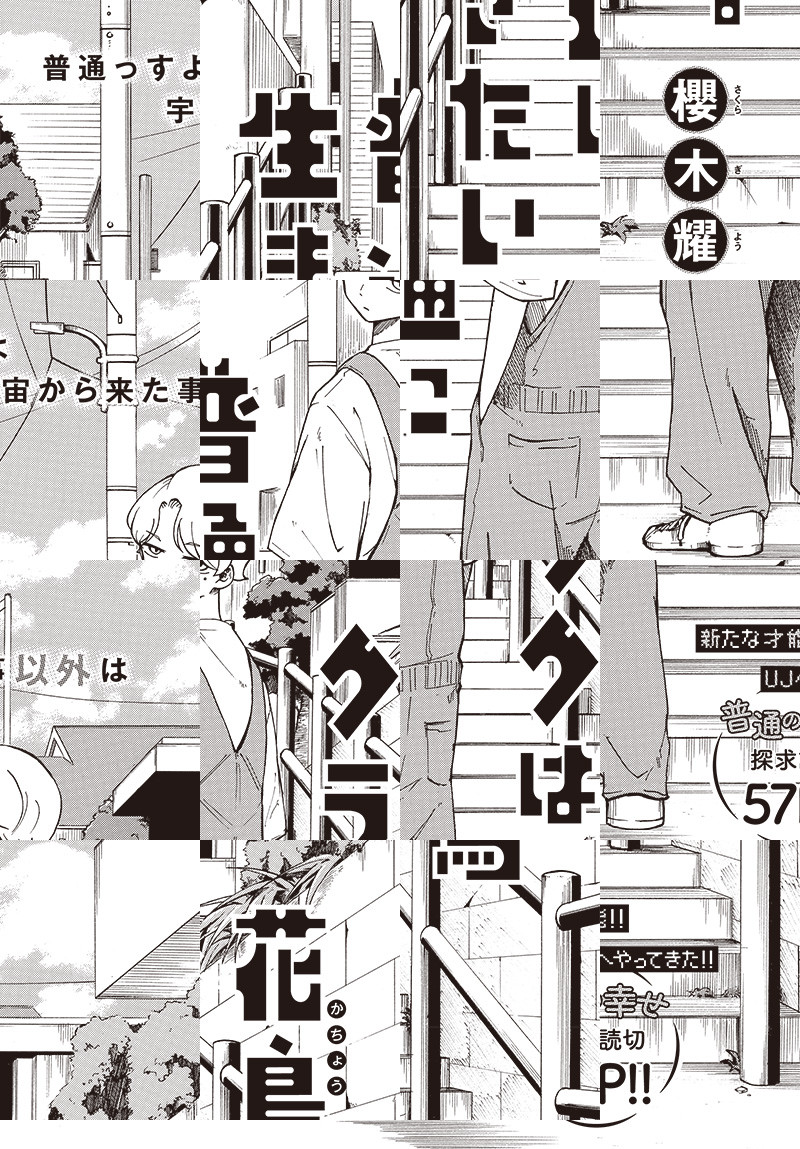 決して高くはない給料でのたまの贅沢や趣味に没頭する休日とか、好きな人と恋人になって食事をしたり映画を観たり。 そういう“普通”に憧れるコンビニ店員の青年、花鳥(かちょう)クラク。 しかし、彼の日常には常に彼を狙う暗殺者の魔の手が…。 惑星・ラルラ出身の青年は、今日一日、愛しのあの子と“普通の喫茶店デート”できるのか!? 新たな才能が贈る、普通の幸せ探求読切57P!!