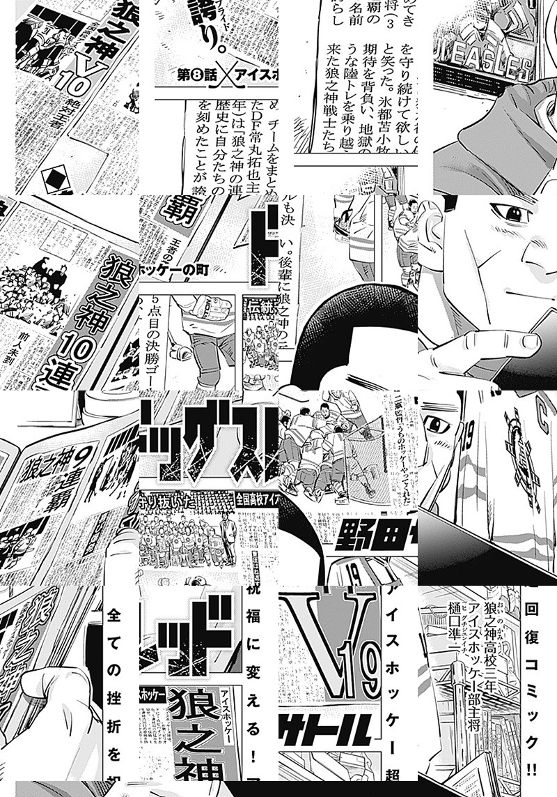 舞台は気高き北の大地・北海道。時代は2010年、平成。 フィギュアスケート、全日本ジュニア選手権大会決勝で歴代最高点を叩き出した白川朗(シラカワロウ)は、なぜか突然、大暴れ。 優勝できたはずの大会で失格、フィギュア界を永久追放されてしまう。 『狂犬王子』という異名をつけられたロウが辿り着いたのは、 氷都・苫小牧、アイスホッケーの街だった!!? 大自然の作り出した天然の池リンク! VS屈強な源間(ゲンマ)兄弟!! 前人未到のインターハイ20連覇がかかる狼之神(オイノカミ)高校!!! そして、強い速い美しい氷上格闘球技・アイスホッケーとの出逢い!!!! 改善、成長、進化!全ての挫折を祝福へ変える、超回復の物語ッ!!!!