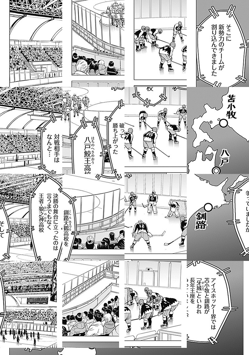舞台は気高き北の大地・北海道。時代は2010年、平成。 フィギュアスケート、全日本ジュニア選手権大会決勝で歴代最高点を叩き出した白川朗(シラカワロウ)は、なぜか突然、大暴れ。 優勝できたはずの大会で失格、フィギュア界を永久追放されてしまう。 『狂犬王子』という異名をつけられたロウが辿り着いたのは、 氷都・苫小牧、アイスホッケーの街だった!!? 大自然の作り出した天然の池リンク! VS屈強な源間(ゲンマ)兄弟!! 前人未到のインターハイ20連覇がかかる狼之神(オイノカミ)高校!!! そして、強い速い美しい氷上格闘球技・アイスホッケーとの出逢い!!!! 改善、成長、進化!全ての挫折を祝福へ変える、超回復の物語ッ!!!!