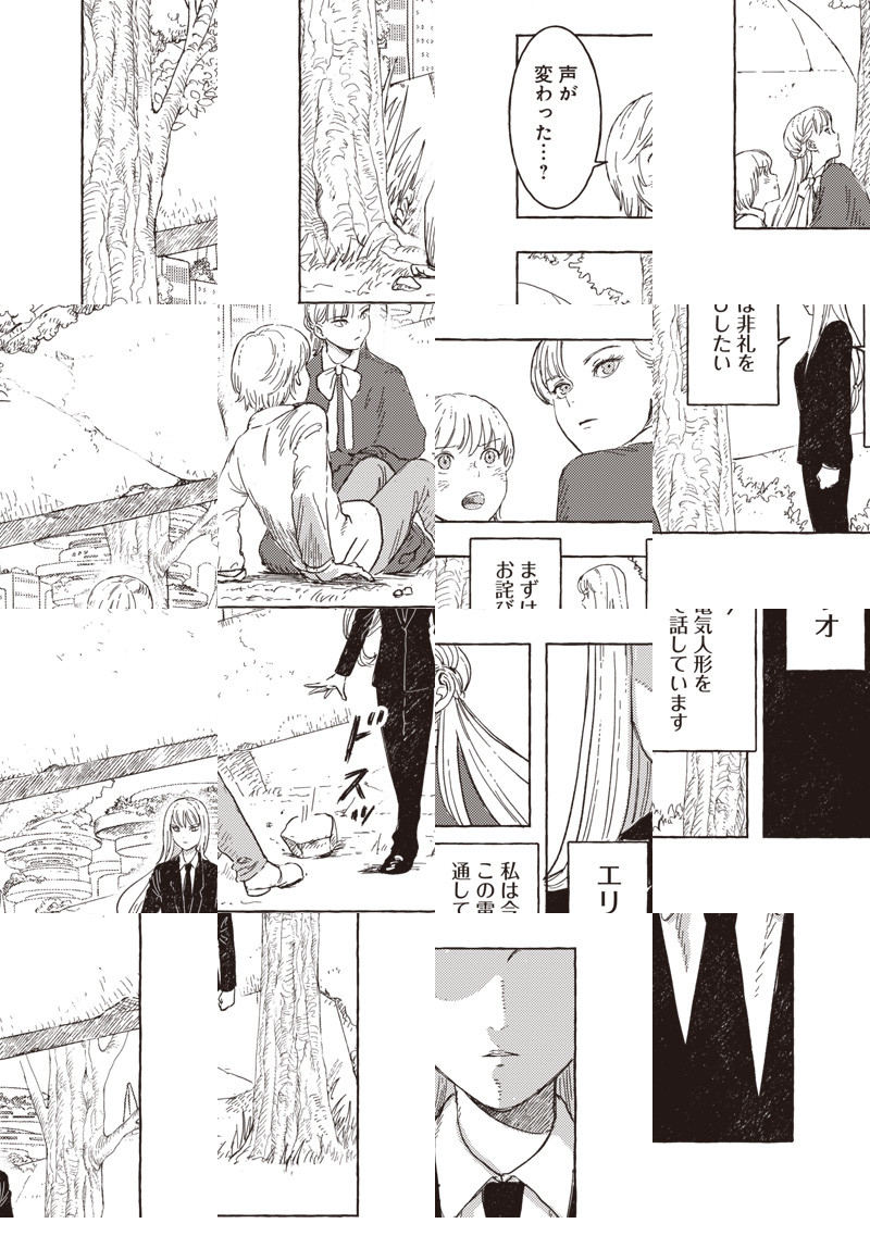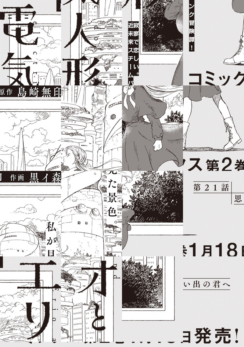 電気人形のアンジュと電気人形に育てられた人間のエリオ。自分以外の人間を知らないエリオに外の世界を見せる為、2人は旅に出る――。 未来なのに懐かしく、機械なのに温かい。近未来でスチームパンクな冒険が始まる!