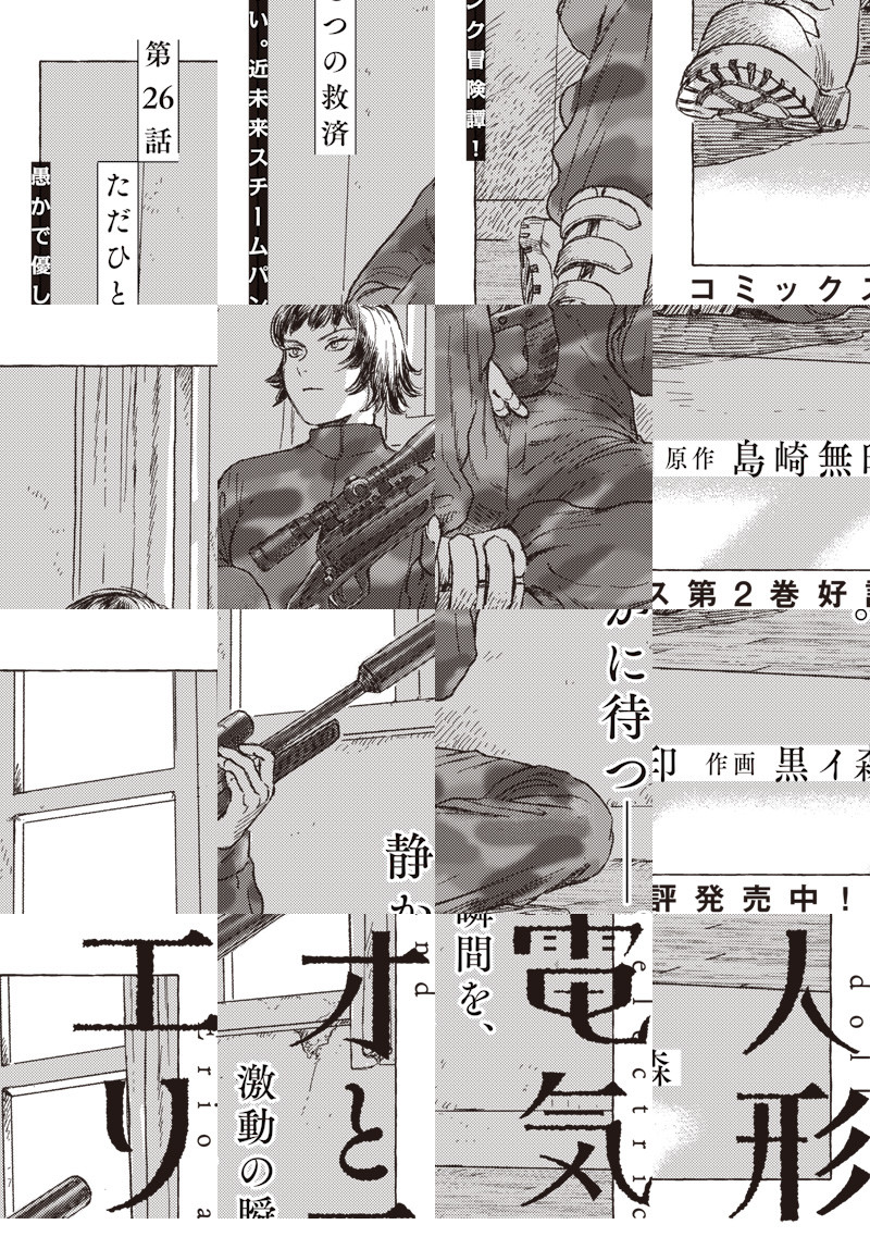 電気人形のアンジュと電気人形に育てられた人間のエリオ。自分以外の人間を知らないエリオに外の世界を見せる為、2人は旅に出る――。 未来なのに懐かしく、機械なのに温かい。近未来でスチームパンクな冒険が始まる!