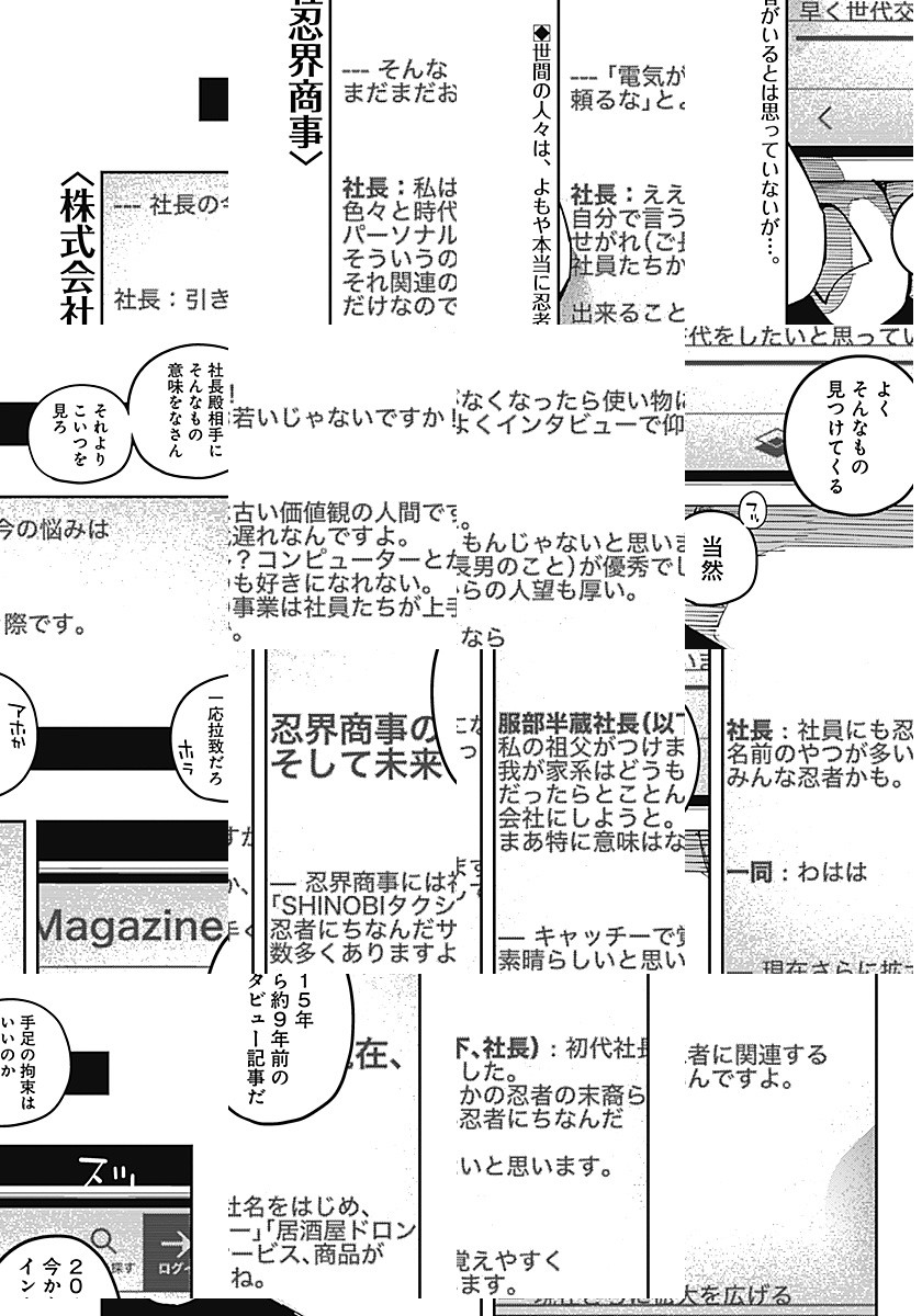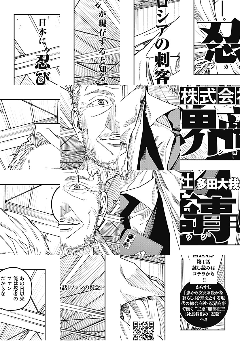 株式会社忍界商事は、「影から支える豊かな暮らし」を理念として、 国民の生活に根差す様々な分野で事業を展開しており、 現代日本の超人気総合商社として広く知られている。 そんな会社の社員である服部正三は、一般的な営業成績は今一つだが… “忍務”では圧倒的な実力を誇っており⁉ 何かがおかしい現代サラリーマンたちの、ごくありふれた日常を描く物語。