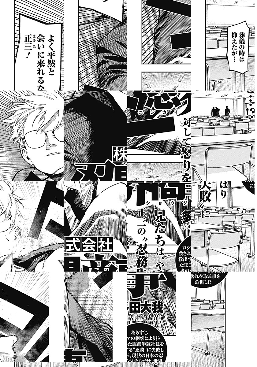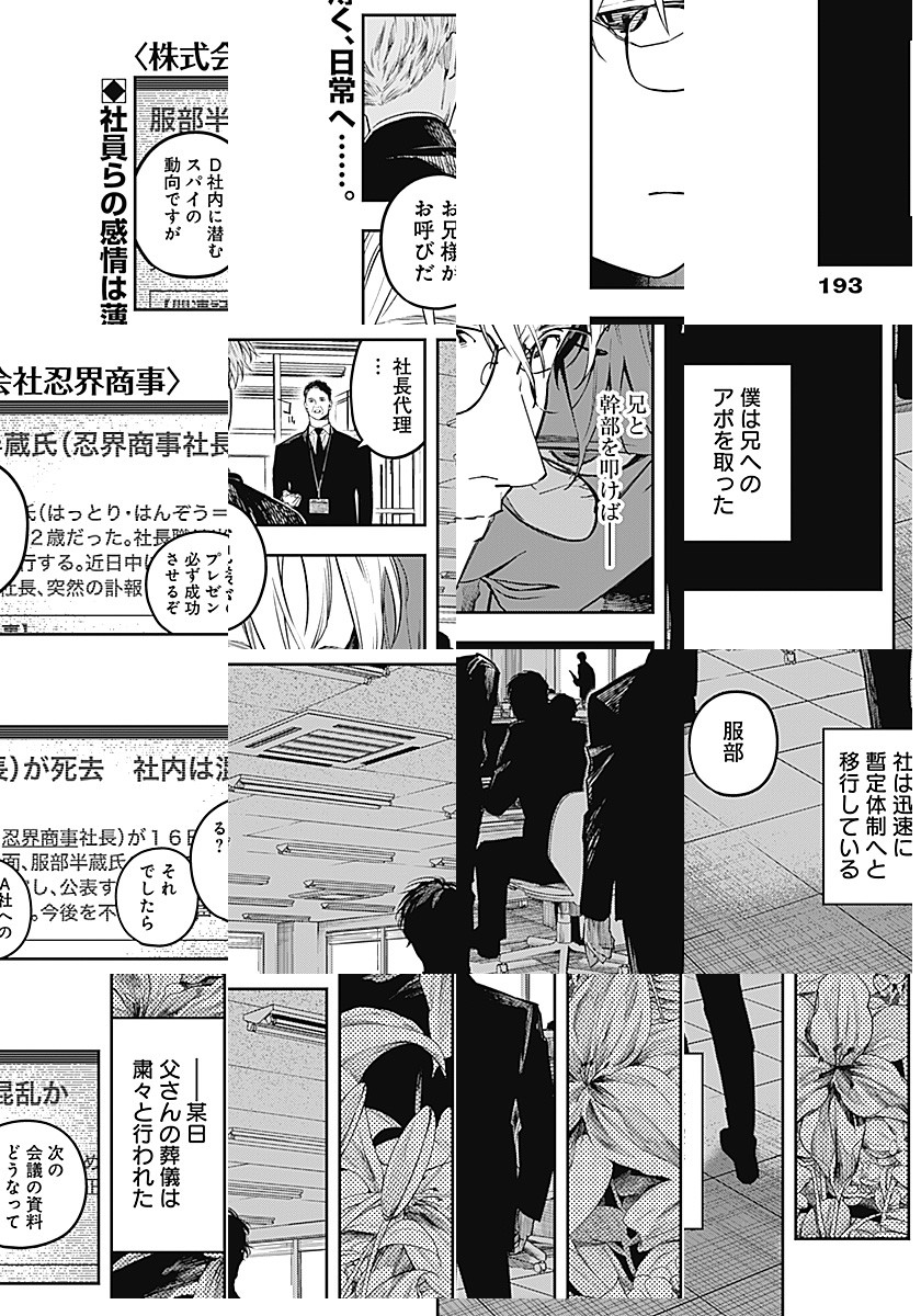 株式会社忍界商事は、「影から支える豊かな暮らし」を理念として、 国民の生活に根差す様々な分野で事業を展開しており、 現代日本の超人気総合商社として広く知られている。 そんな会社の社員である服部正三は、一般的な営業成績は今一つだが… “忍務”では圧倒的な実力を誇っており⁉ 何かがおかしい現代サラリーマンたちの、ごくありふれた日常を描く物語。
