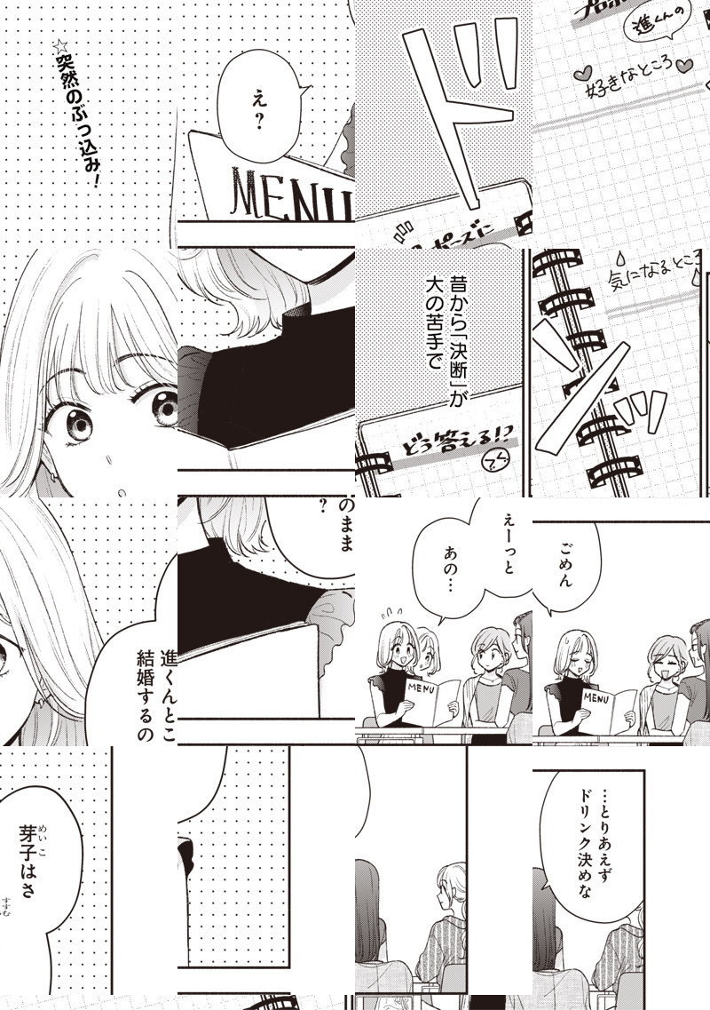 長く付き合っている恋人がいる28歳の芽子。友人にこのまま結婚するのか問われ、答えに窮してしまったが、週末にはプロポーズされる気配があり...!?