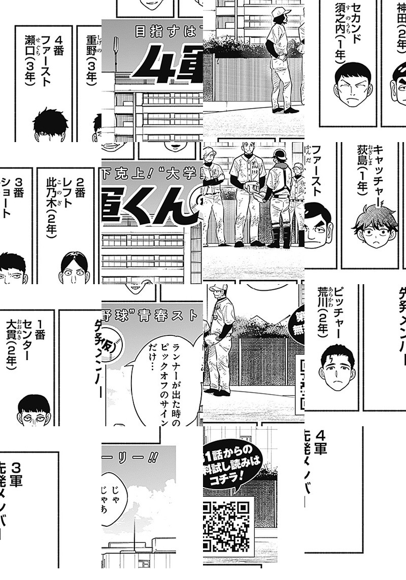 都立高校ながらチームを東東京大会ベスト4にまで導き、 "都立の星"と呼ばれた高校球児・荻島航平。 彼が卒業後の進路として選んだのは神宮球場を聖地とする "都心6大学リーグ"の一つ、池袋大学だった。 ところが入部初日、彼に下されたのはまさかの最下層"4軍"宣告…!? 目指すは下克上!"大学野球"青春ストーリー、開幕!