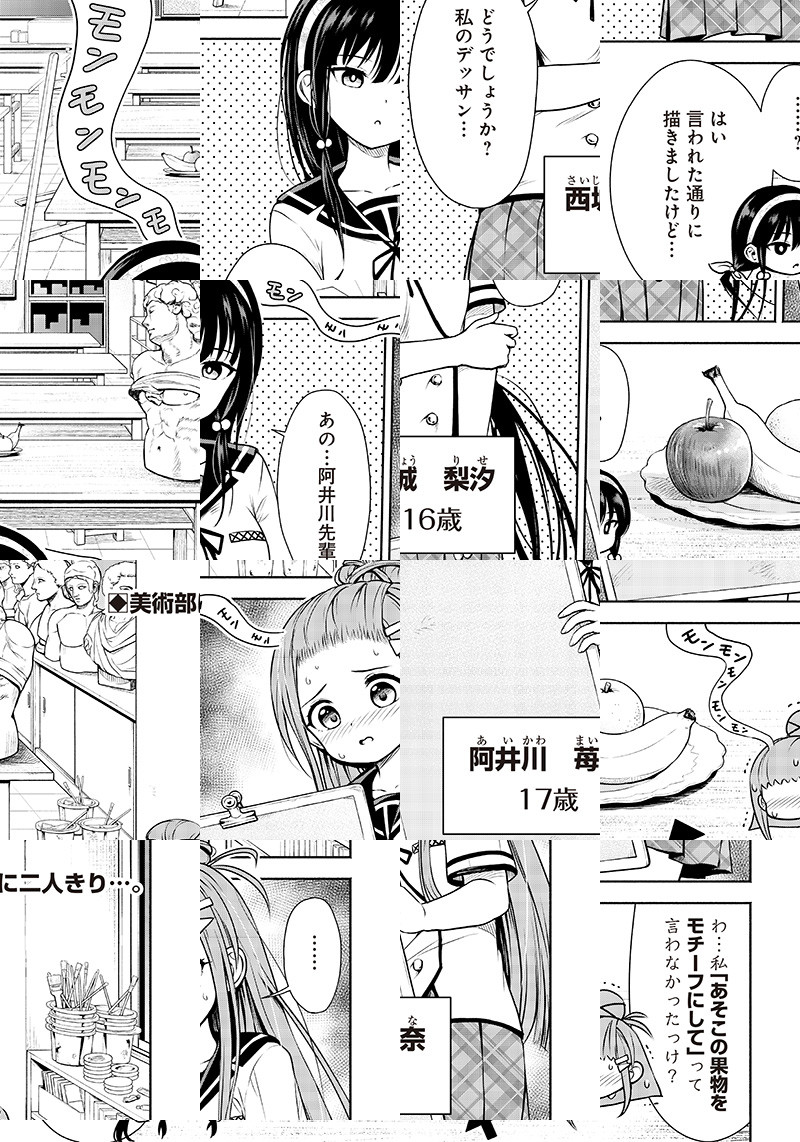 美術部の先輩・苺奈(まいな)はある日、あまり交流のない後輩・梨汐(りせ)の作品を目にする。 初めて見た彼女の作品は…どれもこれも”大人のおもちゃ”!?Hな作品ばかり作る後輩を彼女は正しく導けるのか…!?