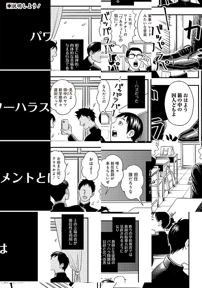 「趣味は制圧!特技は拘束!好きな言葉は強制連行!!」 前時代的で、掟破りde型破り!! この先生は、何者なのか!!? 最低で最高?の教育的指導、GAGの様な新学期(読切)開幕ッ!! 先生の正体と行末を、刮目して見届けよッッ!!