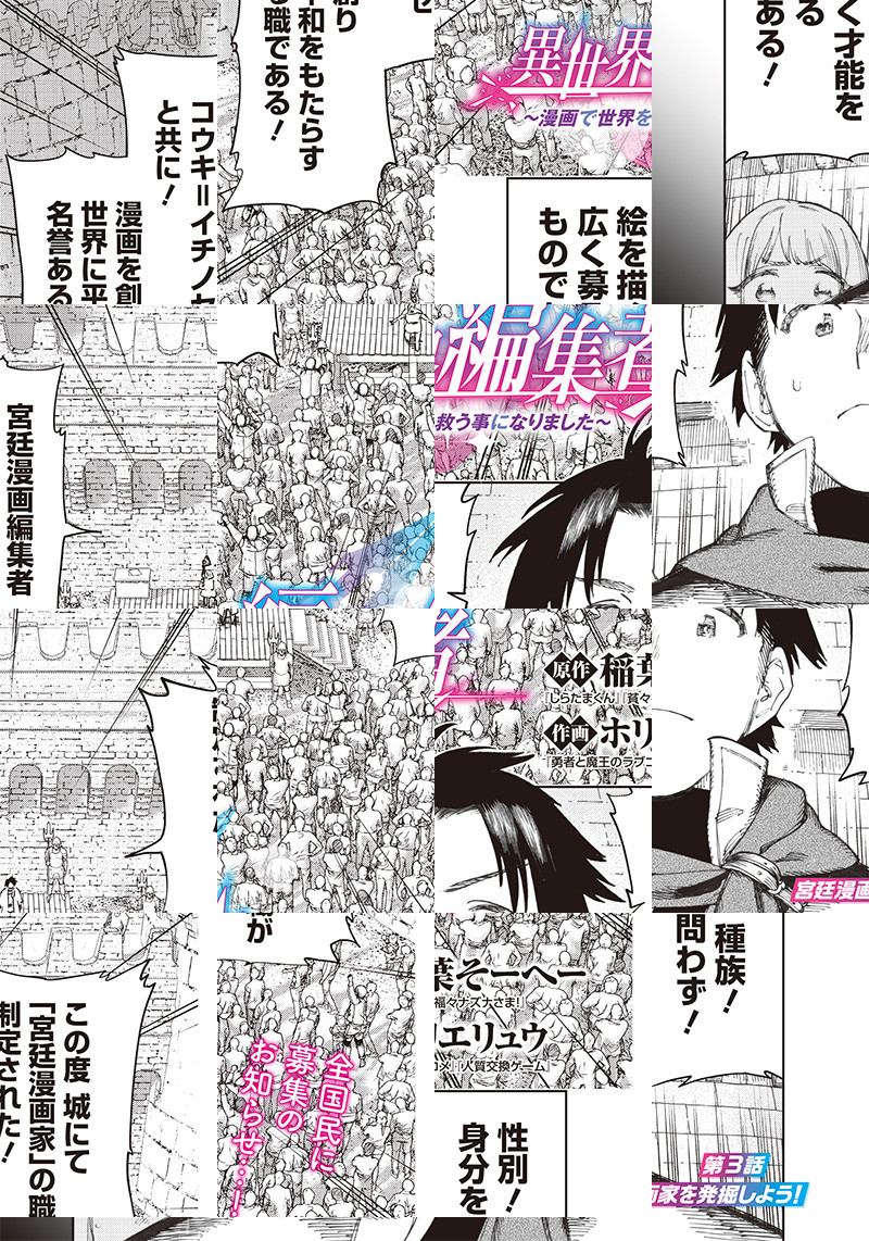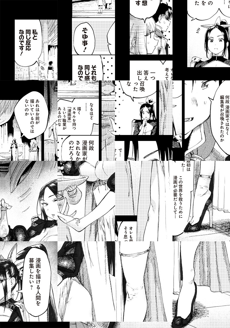 冴えない漫画編集者・一ノ瀬浩輝は、入稿を間際に控えた新連載第1話の原稿を持ったまま、異世界に召喚されてしまう。入稿に間に合わない事が確定する中、召喚士ライラに「救世主様」と呼ばれて…!?
