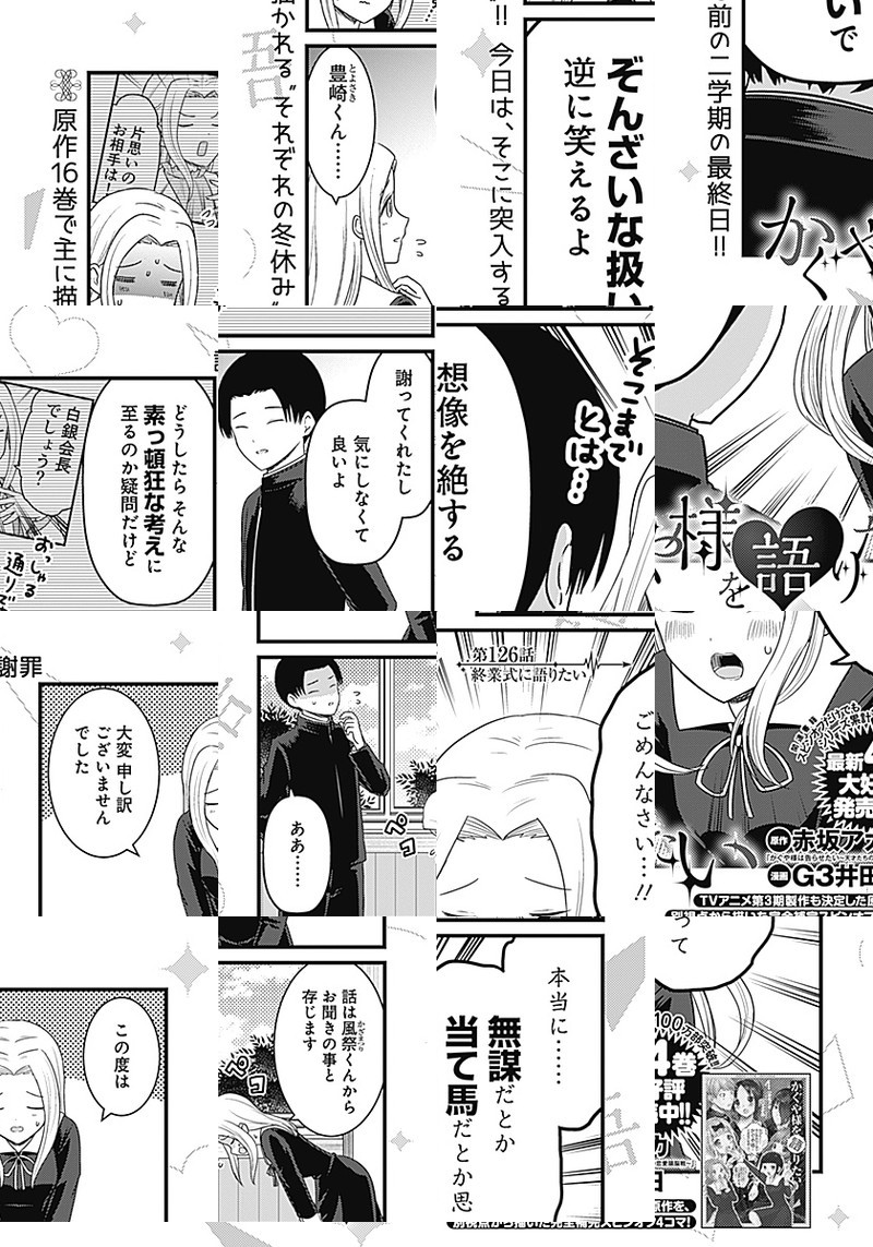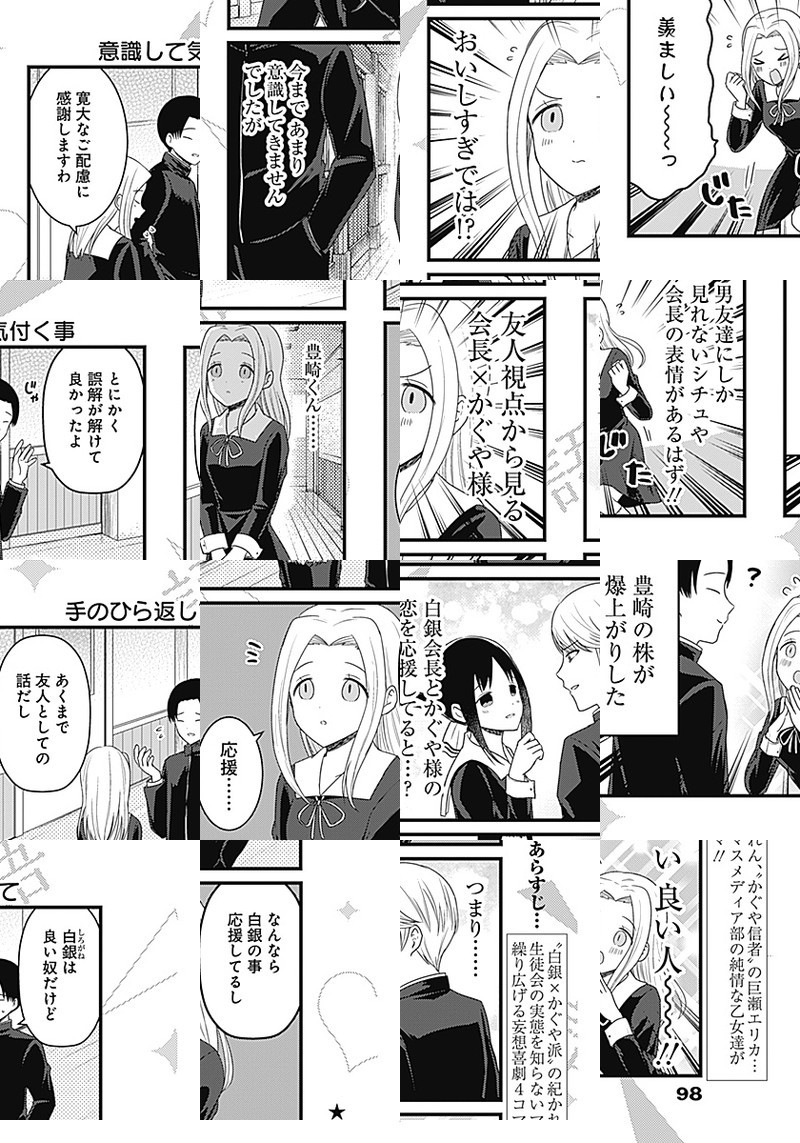 『かぐや様は告らせたい〜天才たちの恋愛頭脳戦〜』TVアニメ化記念、週刊ヤングジャンプ本誌でもスピンオフ作品が連載開始しました。 生徒会の実態を知らない、マスメディア部のメンバーが繰り広げる妄想喜劇4コマ!!