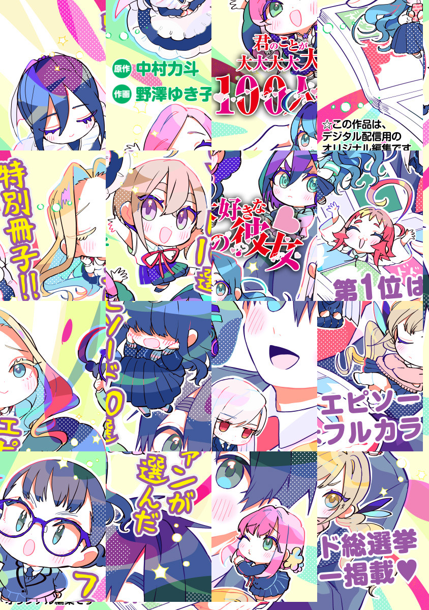 『君のことが大大大大大好きな100人の彼女』最新コミックス7巻発売記念! デジタル版限定の特別冊子! 累計80万部を記念して行われた100カノエピソード総選挙の上位10エピソードが収録! 1位はなんと全ページフルカラー化!! もっと100カノの魅力を知ってほしい! こんなことやあんなことがあったなと懐かしんでほしい! ファンお墨付きのエピソード集! 負けヒロイン0のハーレムラブコメディ・新回答! 週刊ヤングジャンプ・少年ジャンプ+にて大好評連載中!!