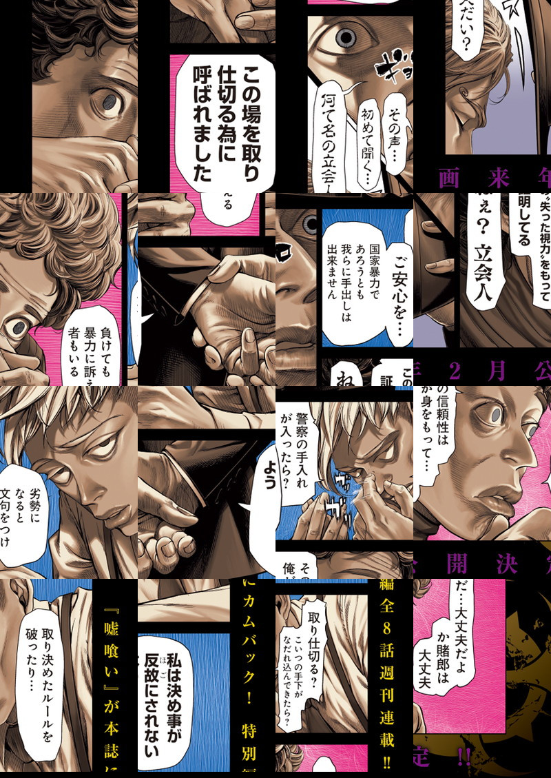 倶楽部賭郎お屋形様に成った斑目貘は、立会人を呼び出し面談を行う。 最初の相手は夜行妃古壱立会人。 その口から語られるのは初めての賭郎立会で…!?