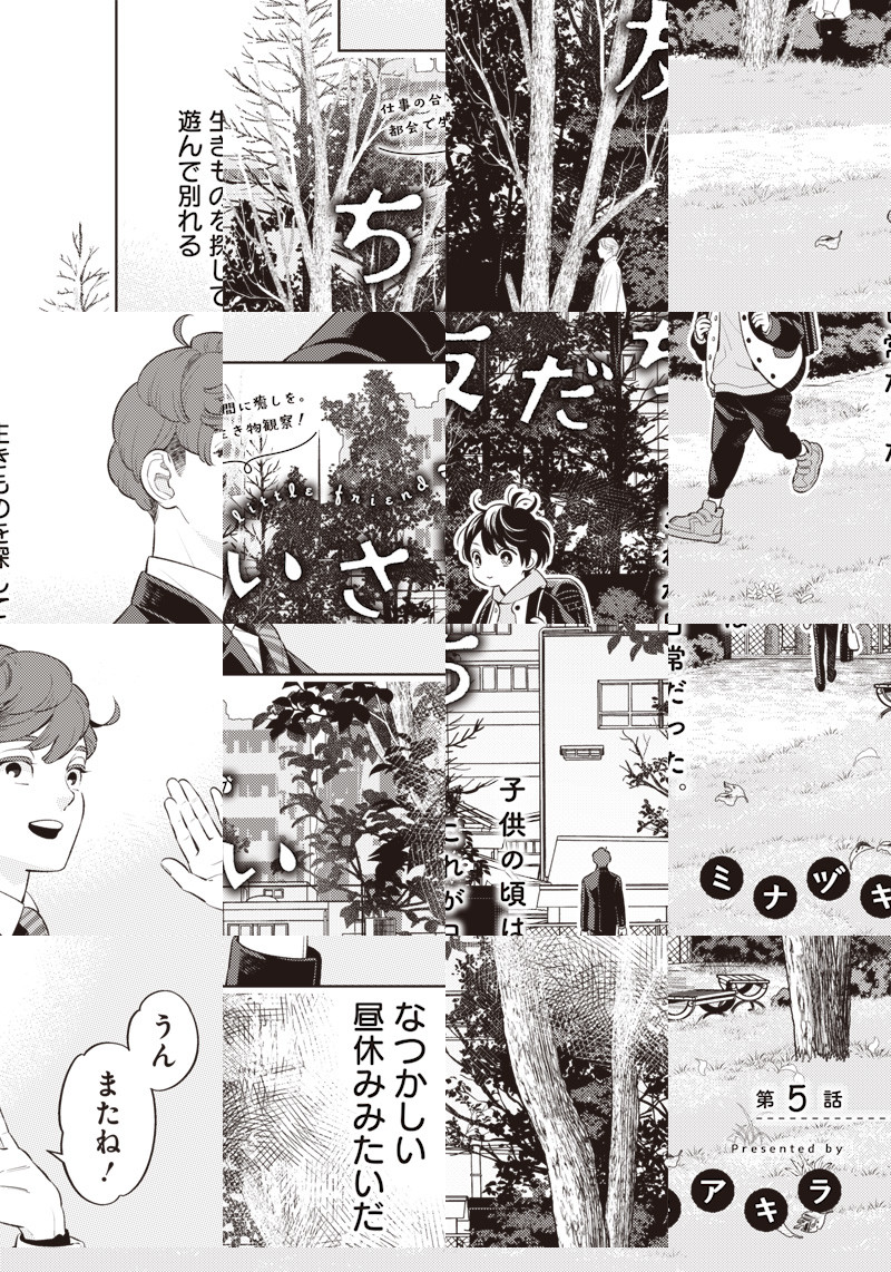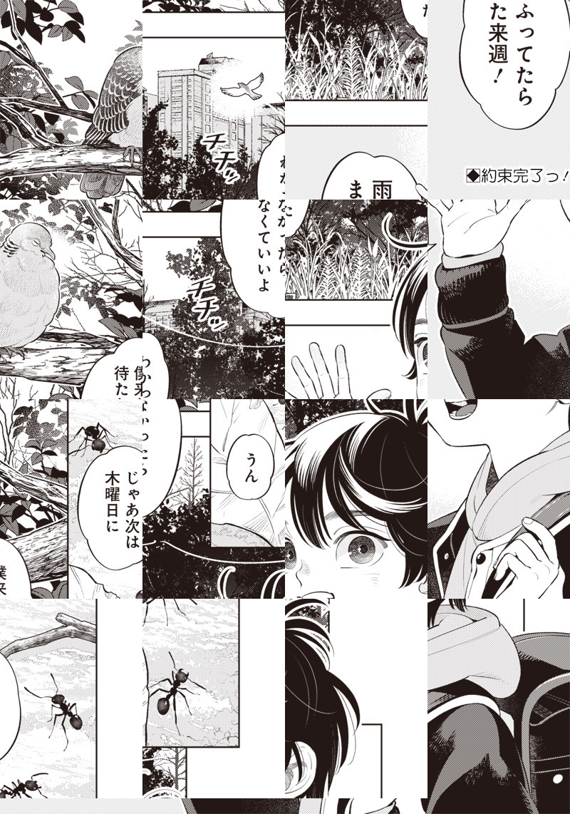 仕事が上手くいかない春原は、休憩中に立ち寄った公園で1人の少年と出会う。 目を凝らせば都会にも溢れている生き物たち。童心に帰る、都会の生き物観察スタート!
