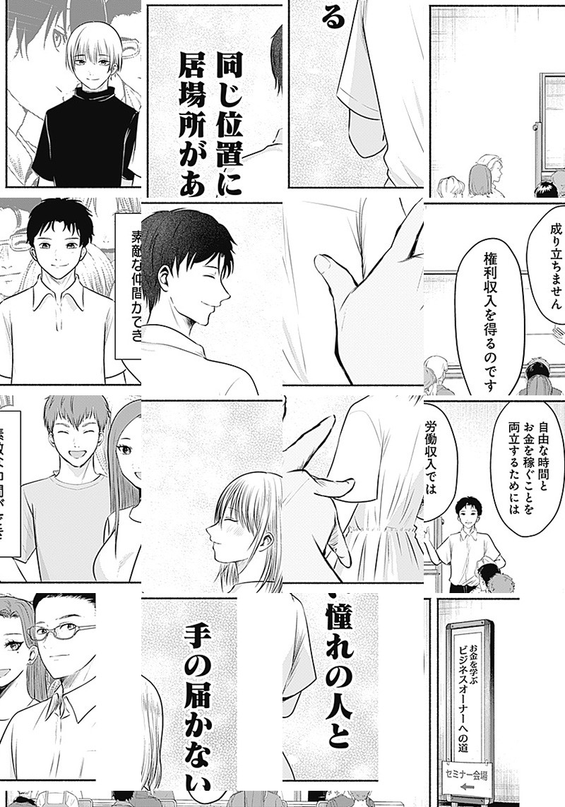 ストーカー被害に悩まされていた看護師の今河彩音は 職場の同僚・田島の営むシェアハウスに住むことになるが、 そこは実は悪徳マルチビジネスの拠点だった。 身寄りのない今河の心の隙間に付け入る黒い思惑は 静かに、着実に彼女の人生を蝕む──。 孤独女子の悪徳ビジネス沈没録、開幕!